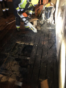 Mit Säbel- und Rettungssäge wurden die Bretter um die Brandausbruchstelle großflächig geöffnet, da die brennenden Tropfen der verbrannten Rattanmöbel auch die Styropordämmung unterhalb des Bodens entzündet hatten. Die sichtbaren Flammen unterhalb des Bretterbodens konnten durch den Angriffstrupp gelöscht und so ein weiteres Ausbreiten verhindert werden. Großes Glück hatten die Hausbewohner, dass durch die enorme Hitzeentwicklung vor dem Küchenfenster nur die äußere Glasscheibe geborsten war und so kein Flammenüberschlag in das Innere des Gebäudes erfolgte. Nach der Kontrolle und Entfernung der Wärmeverbunddämmung an der Hausmauer und im Bereich des Rollladenkastens konnte die Brandstelle vom Einsatzleiter freigegeben werden.