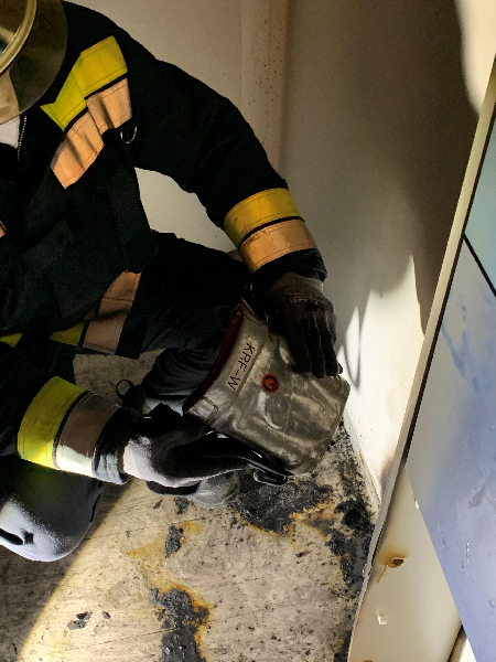Mittels Wärmebildkamera wurde die Brandstelle kontrolliert und mit einem Hochleistungslüfter wurde der giftige Rauch aus der Wohnung entfernt.