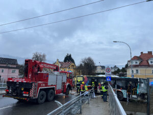 Ein Linienbus kollidierte aus derzeit nicht bekannten Gründen mit Einbauten des Kreisverkehrs und prallte in weiterer Folge gegen ein Brückengeländer sowie in eine Lärmschutzwand der ÖBB-Bahnstrecke. Da der Bus mit einer Achse über die Brücke hinausragte, wurde sofort die Sicherung des Fahrzeugs veranlasst und gleichzeitig die Rettungsaktion der Personen im Fahrgastraum vorbereitet .