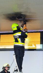 Unverzüglich wurde mit einem Schnellangriffsrohr der Brand bekämpft. In weiterer Folge wurde die Blechverkleidung um der Leuchte mit einer Säbelsäge aufgeschnitten und der Zwischendeckenbereich mit Wärmebild- und Endoskopkamera kontrolliert.