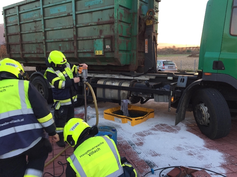 Gegen halb 7 Uhr morgens wurde die Hauptfeuerwache Villach zu einem massiven Dieselaustritt bei einem LKW in die Maria Gailer Straße alarmiert.