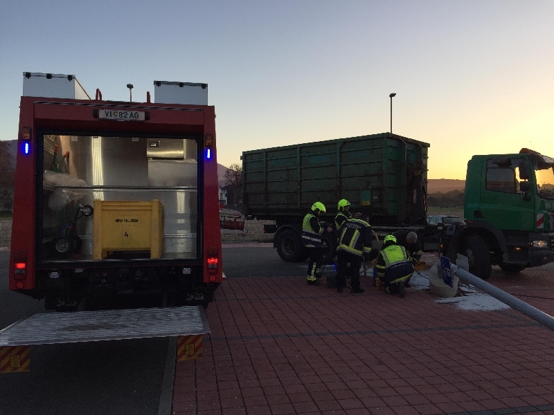 Durch diesen Unfall wurde die Laterne aus der Verankerung gerissen und der Betriebsmitteltank aufgeschlitzt. Durch die Hauptfeuerwache wurde unverzüglich eine Auffangwanne unter den Lkw geschoben und der bereits ausgeflossene Treibstoff mittels Bindemittel gebunden um ein Eindringen in die Kanalisation zu verhindern. Der aufgefangene Diesel wurde abgesaugt und den betroffenen Unternehmen übergeben. Eine Kehrmaschine erledigte die Endreinigung des Parkplatzes. Durch das rasche Eingreifen der Feuerwehr konnte eine Umweltgefährdung verhindert werden.