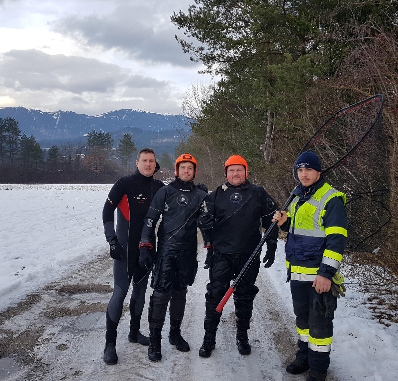 3 Einsatztaucher der Hauptfeuerwache Villach und der Wasserrettung Villach machten sich unverzüglich auf den Weg das Tier aus seiner misslichen Lage zu befreien. Bei der Befreiung des Schwans stellte sich heraus, dass er sich mit den Füßen in einem vergessenen Angelsilk verfangen hatte.