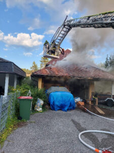 Am 19. August 2023, um 18.24 Uhr, wurden die Hauptfeuerwache Villach, gemeinsam mit den FF Pogöriach, Fellach und Judendorf mit Stichwort B5- Brand Wohnhaus, in die Franz-Gründl-Straße alarmiert. Bereits bei der Zufahrt konnte eine massive Rauchsäule wahrgenommen werden, was der Leitstelle mitgeteilt wurde. Von dieser wurde daraufhin Vollalarm für die Hauptfeuerwache ausgelöst wurde. Nachdem der Löschzug als erste Kräfte am Einsatzort eingetroffen war, konnte nach durchfeführter Lageerkundung festgestellt werden, dass ein PKW vor der Garage im Vorderbereich brannte und das Brandgeschehen bereits auf die Garage ausgedehnt war. Umgehend wurde vom Atemschutztrupp des Tank2 der PKW gelöscht und anschließend weiter in den Dachraum der Garage vorgedrungen. Parallel wurde über die Drehleiter die Dachhaut mittels Rettungssäge geöffnet und der Brand von außen bekämpft. Die Führung der Einsatzarbeit wurde vom Zugskommandanten unserer Wache, BM Christian Dienesch, übernommen. Von den nachrückenden Wehren wurde die Wasserversorgung sichergestellt und ATS-Trupps bereitgestellt. Ein ATS-Sammelplatz wurde eingerichtet. Die getroffenen Maßnahmen zeigten rasch ihre Wirkung, worauf Brand unter Kontrolle gemeldet werden konnte. Nachdem weitere Öffnungen in der Dachhaut durchgeführt worden waren, konnten auch die letzten Glutnester gelöscht werden und somit um 19.50 Uhr Brandaus gemeldet werden. Der örtlich zuständigen FF Pogöriach wurde die Einsatzstelle übergeben, welche auch die Brandwache stellte.