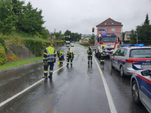 Kurz nach Mittag rückten wir mit 23 Mann und 6 Fahrzeugen gemeinsam mit der FF Vassach zu einer kilometerlangen Dieselspur im Stadtgebiet aus. Ein PKW verlor aufgrund eines technischen Defektes rund 70 Liter Diesel, welcher sich durch den Regen auf die ganze Fahrbahn ausbreitete. Mit mehreren Teams wurden die Treibstoffschlieren mittels flüssigem Bindemittel gebunden.