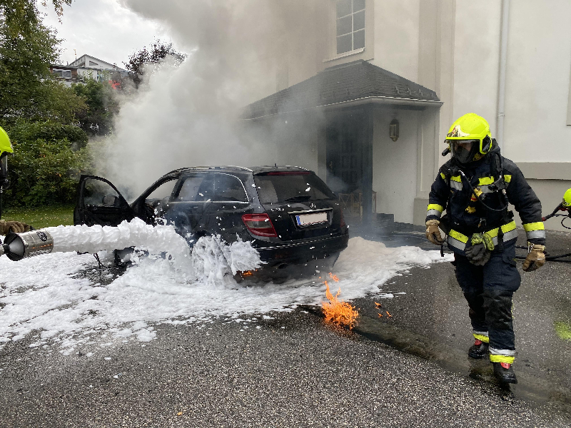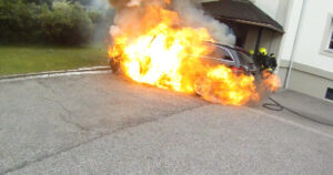 Beim Eintreffen unserer Einsatzkräfte stand der PKW bereits in Vollbrand. Sofort wurde unter schwerem Atemschutz eine Hochdrucklöschleitung vom Tanklöschfahrzeug vorgenommen und das Feuer bekämpft. Ein Übergreifen der Flammen auf das direkt angrenzende Wohnhaus konnte durch den raschen Einsatz der Feuerwehr verhindert werden.