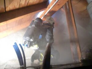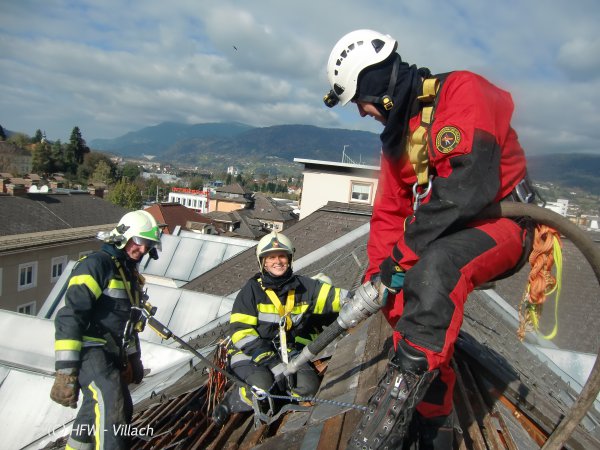 In mühevoller Arbeit wurde der Dachbereich mittels Motorkettensägen geöffnet um an die Glutnester zu kommen. Mit so genannten "Fog Nails“,das sind spezielle Löschnägel, wurden Löschwasser in die Fuge eingebracht.