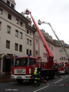 Mittels Drehleiter und Hubsteiger wurde von zwei Seiten, teilweise mit schweren Atemschutzgeräten der Brand bekämpft, um ein Ausbreiten auf die angebauten Gebäudeteile und den kompletten Dachstuhl zu verhindern.