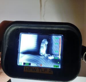 „Um die Gefahr eines Ausbreitens des Feuers durch die Hohlräume in den Wänden zu verhindern, wurde der Wandbereich großzügig geöffnet um vorhandene Glutnester mittels Wärmebildkamera zu entdecken.