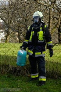 Nachdem die Gaskonzentration bis unterhalb der "Unteren- Explosionsgrenze" verdünnt war, drang ein Atemschutztrupp in den Keller vor und brachte die Gasflasche in einem gesicherten Bereich ins Freie.