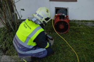 Nachdem mehrere Druckbelüftungsgeräte an der Grenze zum messbaren Gas- Luftgemisch aufgestellt wurden begannen wir mit umfangreichen Belüftungsmaßnahmen, zeitgleich wurde mit explosionsgeschützen Absauggeräten  das Flüssiggas, welches schwerer ist als Luft, aus dem Keller abgesaugt.