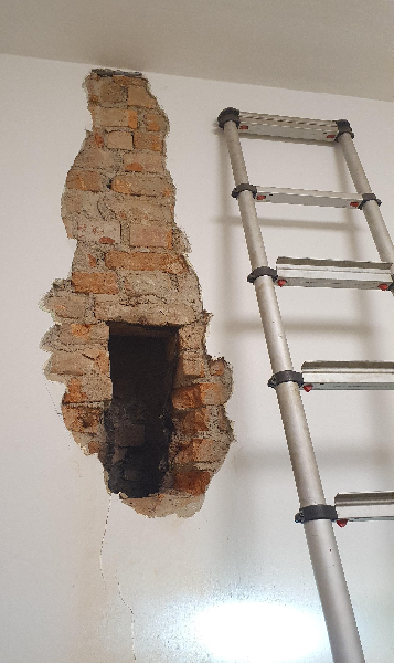 Im Inneren der Wohnung wurden gemeinsam mit dem Mieter die wichtigsten Dinge aus dem Zimmer entfernt und dann mittels Bohr-Schremmhammer aus dem Rüstlöschfahrzeug die Ziegelwand geöffnet und der Kamin Strang dahinter freigelegt. Darin befand sich aus unbekannter Ursache glosendes Dämmmaterial.