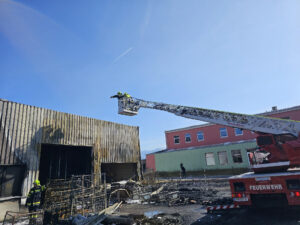 Zusätzlich musste noch die Blechfassade der Halle demontiert werden, um Glutnester in der Dämmung dahinter auszuschließen.