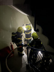 Als der Löschzug der Hauptfeuerwache am Einsatzort eintraf, konnte bereits massiver Rauch aus dem Keller festgestellt werden. Das gesamte Stiegenhaus war bereits voller Rauch und versperrte den Bewohnerinnen und Bewohnern den Fluchtweg.