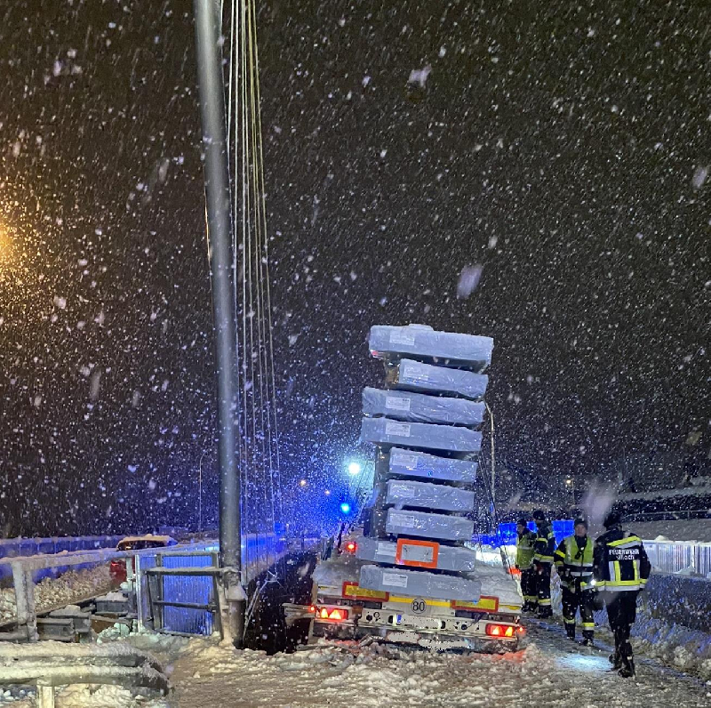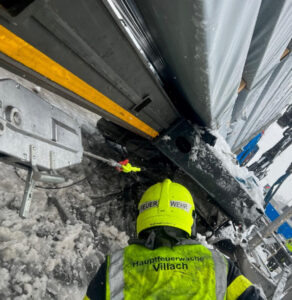 Gegen 5:00 Uhr morgens musste ein beladener Sattelzug auf der B83 in Villach-Landskron einem anderen PKW, welcher plötzlich auf die Vorrangstraße auffuhr, verkehrsbedingt ausweichen. Dadurch kam der LKW im dichten Schneefall auf der glatten Fahrbahn ins Rutschen, fuhr in weiterer Folge gegen die Betonleitwand und schleuderte nach links auf die Leitschiene. Dabei wurde die Leitschiene stark beschädigt und Teile fielen auf die darunter führende Gemeindestraße. Glücklicherweise kippte der Sattelzug nicht seitwärts in den ca. 1 m breiten, offenen Spalt zwischen den beiden Fahrbahnen.