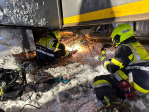 „Außerdem mussten durch die Feuerwehr mittels Trennschleifer und Säbelsäge die verkeilten Teile der Leitschiene unter dem Sattelanhänger abgeschnitten und mit dem Greifzug herausgezogen werden. Des Weiteren wurden die losen Teile von der Straße unter der Brücke entfernt.“