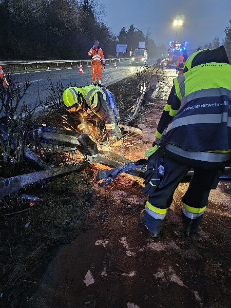 Mittels Trenngeräten von unserem Rüstlöschfahrzeug musste die völlig deformierte Leitschiene, welche teilweise auf die Fahrbahn ragte, durchgeschnitten werden.
