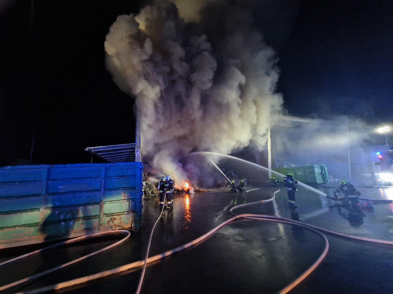 Beim Eintreffen stand bereits ein überdachter Bereich des Recyclingzentrums, in dem unsortierter Restmüll gelagert war, in Vollbrand. Der Einsatzleiter teilte das Gelände rasch in mehrere Einsatzabschnitte ein, um die Kräfte gezielt koordinieren zu können.