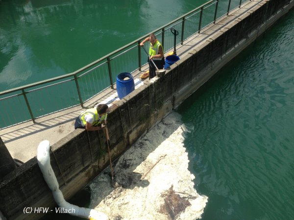 Von uns wurde Mittels 2 Booten die Ölsperre ins Wasser gebracht und am Ufer verheftet, weiters musste der so Aufgefangene Schadstoff mittels Bindemittel gebunden werden und händisch aus dem Fluss geschöpft werden, und in bereitgestellten Fässern aufgefangen.