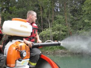 Ebenso wurde zum Uferschutz eine Ölsperre errichtet und großflächig mittels Rückenspritze Bioversal aufgetragen.