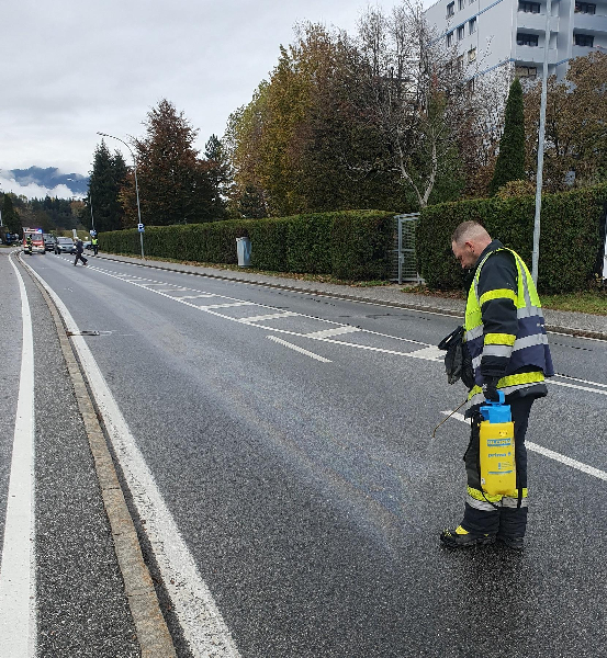 Gegen 09:30 Uhr forderte eine größere Dieselspur im Stadtgebiet den Einsatz unserer Wache mit Unterstützung der örtlich zuständigen FF St. Martin. Eine defekte Dieselleitung bei einem Fahrzeug des Städtischen Wirtschaftshofes  verursachte eine mehrere hundert Meter lange Ölspur, im Bereich der Tirolerstraße in Villach.  Mittels flüssigen Bindemittels wurde der Treibstoff, welcher sich durch den leichten Regen bereits über die Fahrbahn ausgebreitet hatte,  gebunden und die Straße gereinigt.