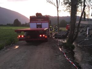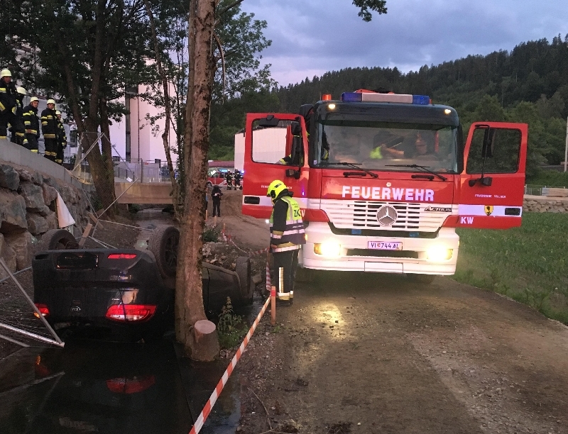 Ein abgestellter PKW kam aus noch nicht genau geklärter Ursache ins Rollen und stürzte, glücklicherweise ohne den Lenker, über eine Mauerer über den Fahrbahnrand und kam am Dach im dortigen Seebach zu liegen. Mittels dem Kran unseres Wechselladerfahrzeuges konnte der PKW aus dem Wassre geborgen werden und wieder auf die Räder gestellt werden. Nach rund 30 Minuten konnte der PKW geborgen werden und durch ein privates Abschleppunternehmen von der Unfallstelle verbracht werden.