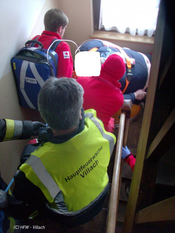 In einer Wohnung im 2. Obergeschoss eines Mehrparteienhauses kam es zu einem medizinischen Notfall. Auf Grund der Tatsache das der Patient stark Adipös war es dem RK-Team nicht möglich den 29 jährigen Patienten - der rasch medizinische Unterstützung benötigte allein zu bergen – so Einsatzleiter HBI Harald Geissler Kommandant der Hauptfeuerwache Villach .