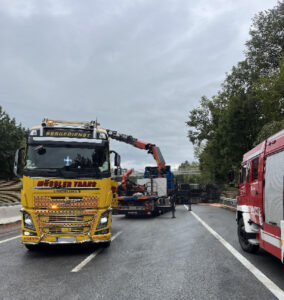 Derzeit ist ein privates Bergeunternehmen im Einsatz, um den Sattelzug zu entladen und wieder aufzurichten.