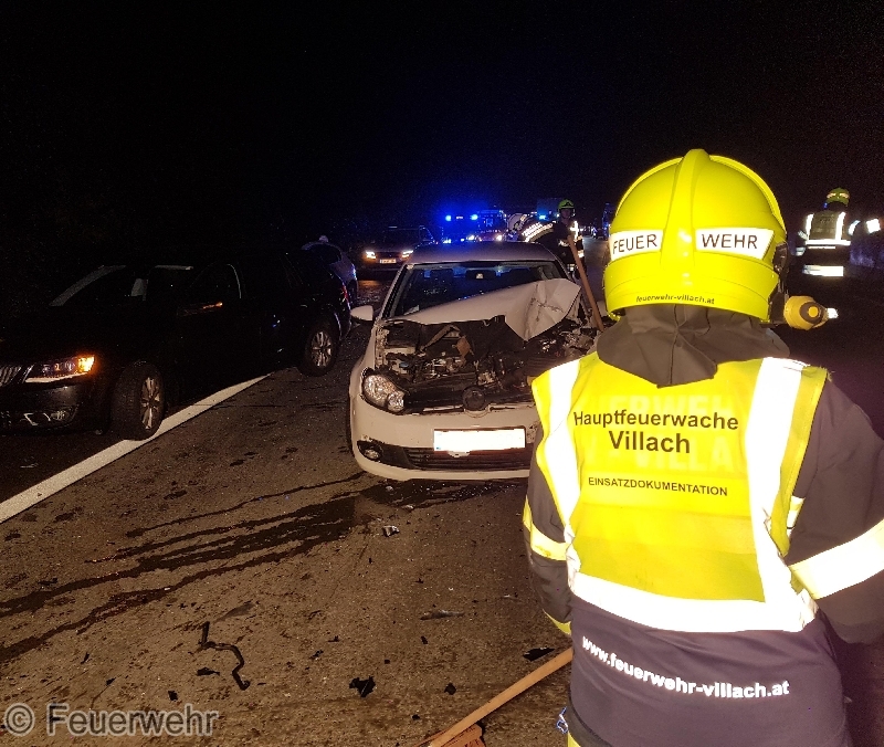 Kurz nach 20 Uhr wurde die Hauptfeuerwache Villach gemeinsam mit der Freiwilligen Feuerwehr Wernberg und Velden zu einem schweren Unfall mit vermutlich eingeklemmten Personen auf die A2 Südautobahn in Fahrtrichtung Klagenfurt alarmiert. Am Einsatzort konnte festgestellt werden das glücklicherweise keine Personen in den Fahrzeugen eingeklemmt waren.Ein Kleintransporter sowie 3 PKW waren bei diesem Unfall beteilig. Der Lieferwagen lag auf der Seite, ein Kleinwagen wurde durch die Wucht auf den Grünstreifen geschleudert und kam am Dach zu liegen. Zwei weitere PKW wurden ebenfalls erheblich beschädigt. Durch das Rote Kreuz mit Notarzt wurden 3 Patienten versorgt und mit Verletzungen unbestimmten Grades ins LKH Villach verbracht.Unsere Aufgabe bestand in der Ausleuchtung sowie Absicherung der Unfallstelle, des weiteren mussten ausgeflossener Treibstoff und Motoröl gebunden werden. Die Feuerwehr Velden stellte mittels Kranfahrzeug den Transporter wieder auf die Räder. Auf Ersuchen der Autobahnpolizei Villach wurden die ersten 2 Fahrstreifen gereinigt und die Unfallwracks am Pannenstreifen gesichert abgestellt, wo sie dann von privaten Abschleppfirmen abgeholt werden. Im Einsatz standen die oben erwähnten Feuerwehren unter der Einsatzleitung der FF Wernberg sowie das Rote Kreuz mit Notarzt und die Autobahnpolizei Villach mit mehreren Streifen.