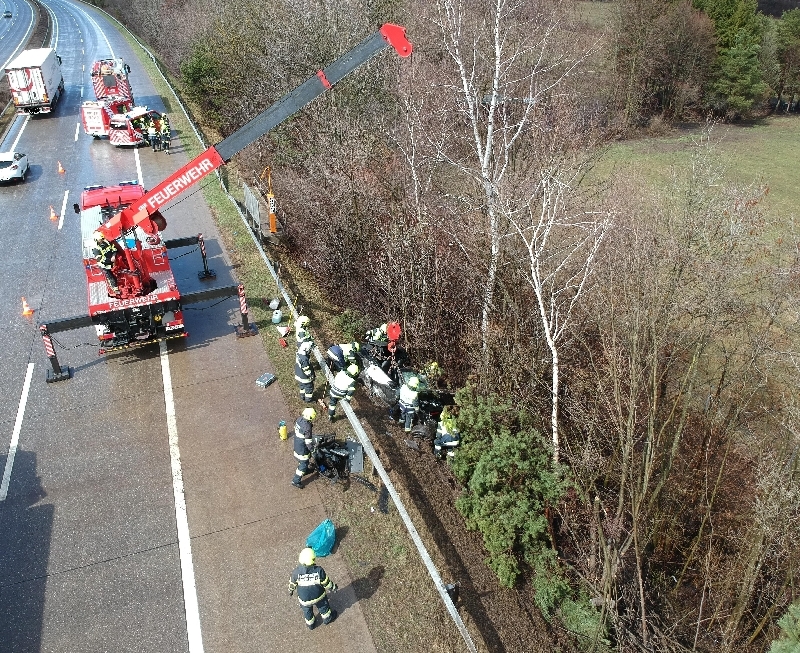 Am Einsatzort konnte festgestellt werden, dass ein PKW aus noch unbekannter Ursache von der Fahrbahn abgekommen ist, sich überschlagen und die Leitschiene durchstoßen hat. Die Bäume neben der Autobahn verhinderten dabei ein weiteres Abrutschen über die steile Böschung. Ein verletzter Insasse lag bereits neben dem PKW, ein zweiter musste durch die Einsatzkräfte der Feuerwehr gemeinsam mit dem Roten Kreuz aus dem Fahrzeug geborgen werden. Glücklicherweise war keine Person im Fahrzeug eingeklemmt. Beide Verletzten wurden vom Notarztteam des Roten Kreuzes sowie des ebenfalls angeforderten Rettungshubschrauber RK 1 erstversorgt.