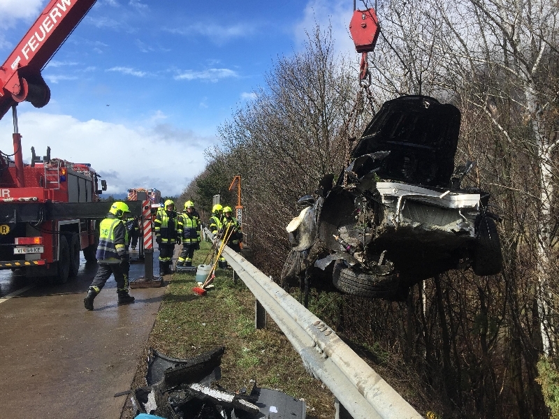 Parallel dazu wurden Absicherungs- und Brandschutzmaßnahmen durch die anwesenden Feuerwehren sichergestellt. Die vermutlich schwerverletzten Personen wurden nach der Stabilisierung in die Krankenhäuser verbracht. In Absprache mit der Autobahnpolizei wurde das völlig zerstörte Cabrio mit dem schweren Rüstfahrzeug (RKW12) aus der Böschung gehoben und einem privaten Abschleppunternehmen übergeben. Nach den Aufräumarbeiten und dem Binden von ausgelaufenen Betriebsmitteln im Grünstreifen sowie auf der Fahrbahn konnten die Einsatzstelle an die ASFINAG übergeben werden.