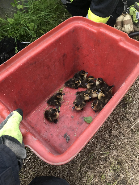Durch die Einsatzkräfte wurde sofort der Bereich abgesichert und die Kücken behutsam in eine Kunststoffwanne gegeben um sie aus dem Gefahrenbereich zu retten.