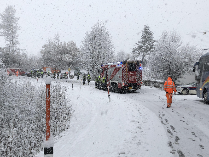 Beim Eintreffen der ersten Einsatzkräfte am Unfallort konnte folgende Lage erkannt werden. Vier Fahrzeuge waren in einer unübersichtlichen Kurve bei starken Schneefall miteinander kollidiert.