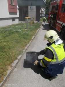 Eine Löschleitung mit schwerem Atemschutz wurde vorbereitet, zeitgleich wurde mit einem hydraulischen Türöffner die Eingangstüre der Wohnung aufgebrochen.