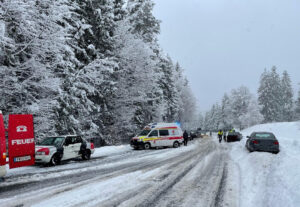 Beim Eintreffen der diensthabenden SET Kräfte der Hauptfeuerwache am Unfallort, konnte folgende Lage erkannt werden: 3 Fahrzeuge waren bei starken Schneefall miteinander kollidiert und steckten teilwiese im Schnee am Fahrbahnrand!