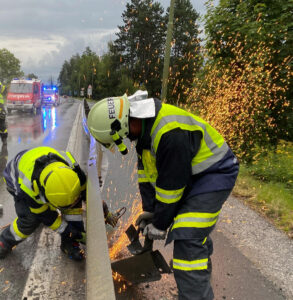 Für die Feuerwehren galt es die Unfallstelle auf der Fahrbahn stadtauswärts abzusichern und auslaufende Betriebsmittel zu binden. Im weiteren Einsatzverlauf wurde ein demolierter Steher der Leitschiene mit dem Trennschleifer entfernt.