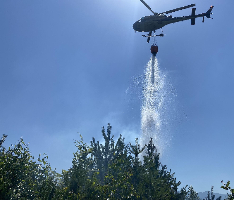 Durch die ersten Kräfte wurden 2 Löschleitungen für die ersten Brandbekämpfungsmaßnahmen vorgenommen. Fast zeitgleich traf der Hubschrauber „Libelle“ des BMI ein. Nach einem kurzen Überflug des Hubschraubers wurde der Löschbehälter „Bambi Bag“ zum Hubschrauber gehängt und dieser konnte rasch mit der Brandbekämpfung aus der Luft beginnen. Durch den glücklichen Umstand, dass der See unmittelbar neben dem Brandherd lag, brauchte der Hubschrauber nur rund eine knappe Minute für den Abwurf und die Wiederbefüllung. Die Flughelfer der Feuerwehr koordinierten den punktgenauen Einsatz des Hubschraubers vom Boden über Funk.