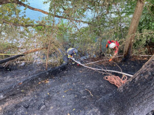 Nach dem Ablöschen des Feuers musste händisch die Bodenbrandbekämpfung teilweise unter Seilsicherung durch die „MRAS“ Gruppe der Hauptfeuerwache durchgeführt werden.
