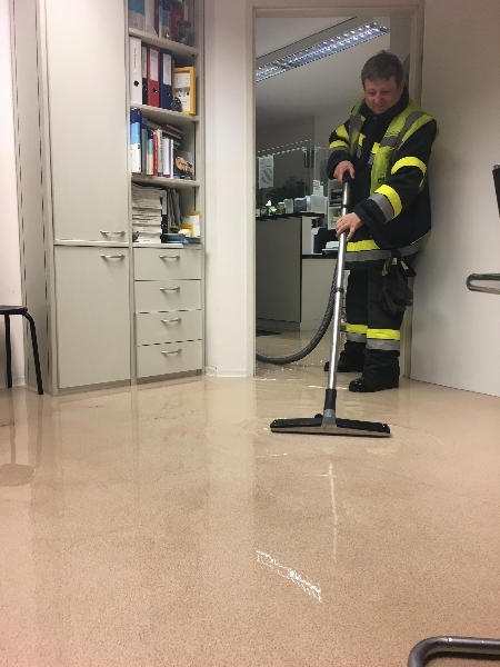 In der Ordination konnte ein defekter Plastikzylinder eines Frostwächters der Wasserleitung als Ursache für den massiven Wasserschaden festgestellt werden. Nach dem Abstellen der Wasserleitung konnte mit zwei Naßsaugern alle Geschoße nacheinander von oben nach unten (bis in das 1. OG) trockengelegt werden. Weitere Maßnahmen zum Trockenlegen der durchnässten Geschoße wird von einer Fachfirma durchgeführt.