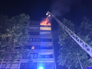 Im siebten Stock des Gebäudes stand eine Wohnung in Vollbrand. Die Flammen hatten bereits über den Balkon nach außen geschlagen und drohten, auf das Dach sowie die darüber liegende Terrassenwohnung überzugreifen.
